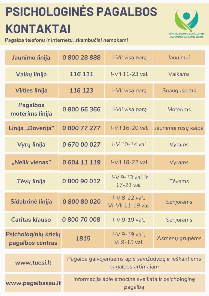 Mūsų partneriai, Kupiškio rajono savivaldybės visuomenės sveikatos biuras, kreipiasi norėdami pasidalinti aktualia informacija apie nemokamai teikiamą psichologinę pagalbą Kupiškio rajono savivaldybės gyventojams.