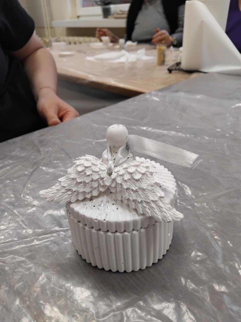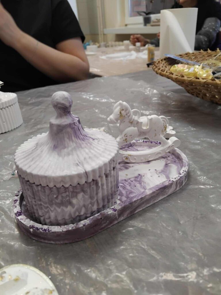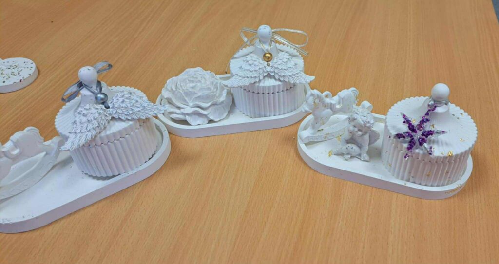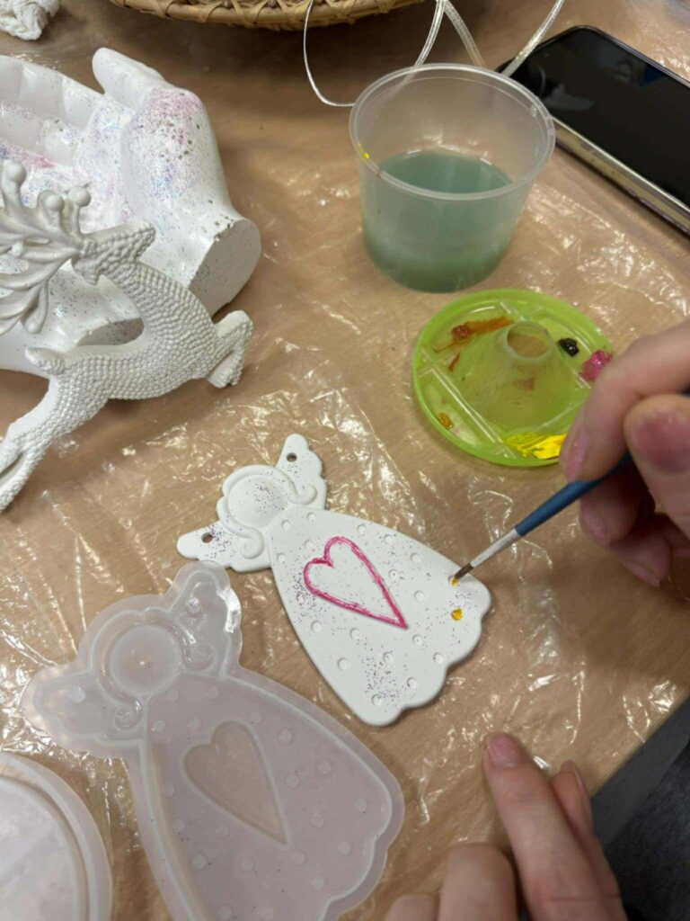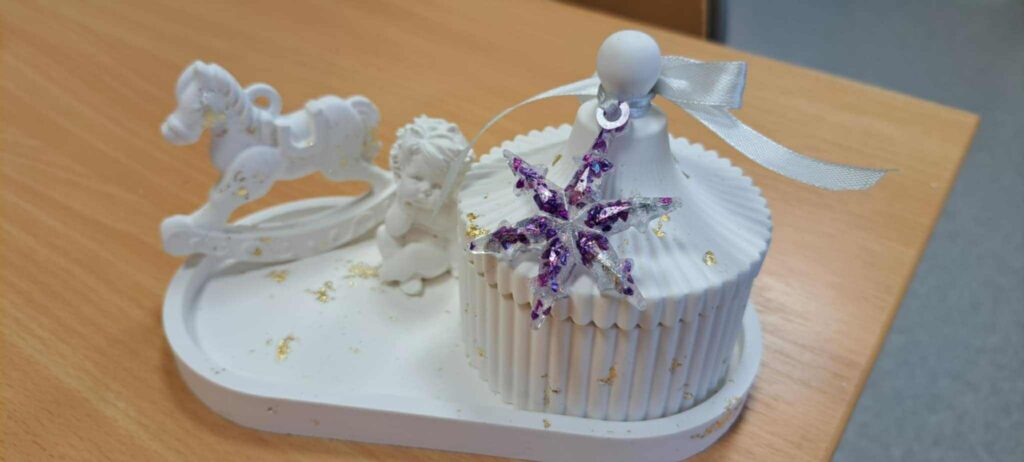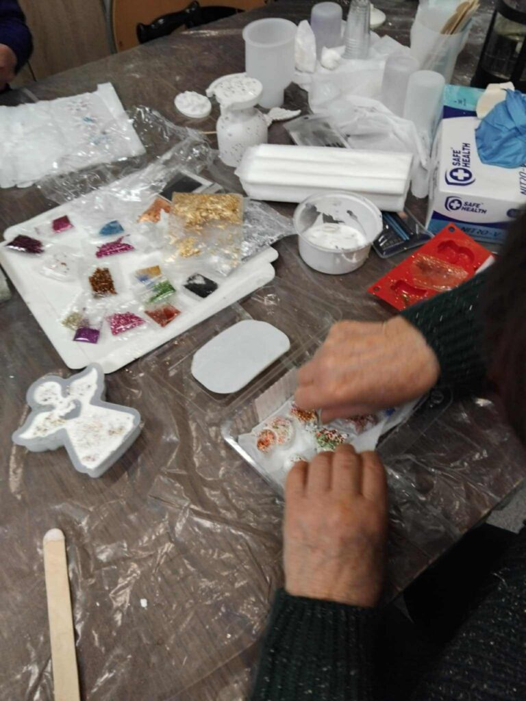 Edukacijos dalyviai vedami smalsumo ir kūrybiškumo liejo įvairias formas iš mineralinės dervos ir epoksido. Gimė nuostabūs ir šilti rankų darbo žaisliukai, kurie sukurs jaukias ir spalvingas emocijas belaukiant didžiųjų metų švenčių.