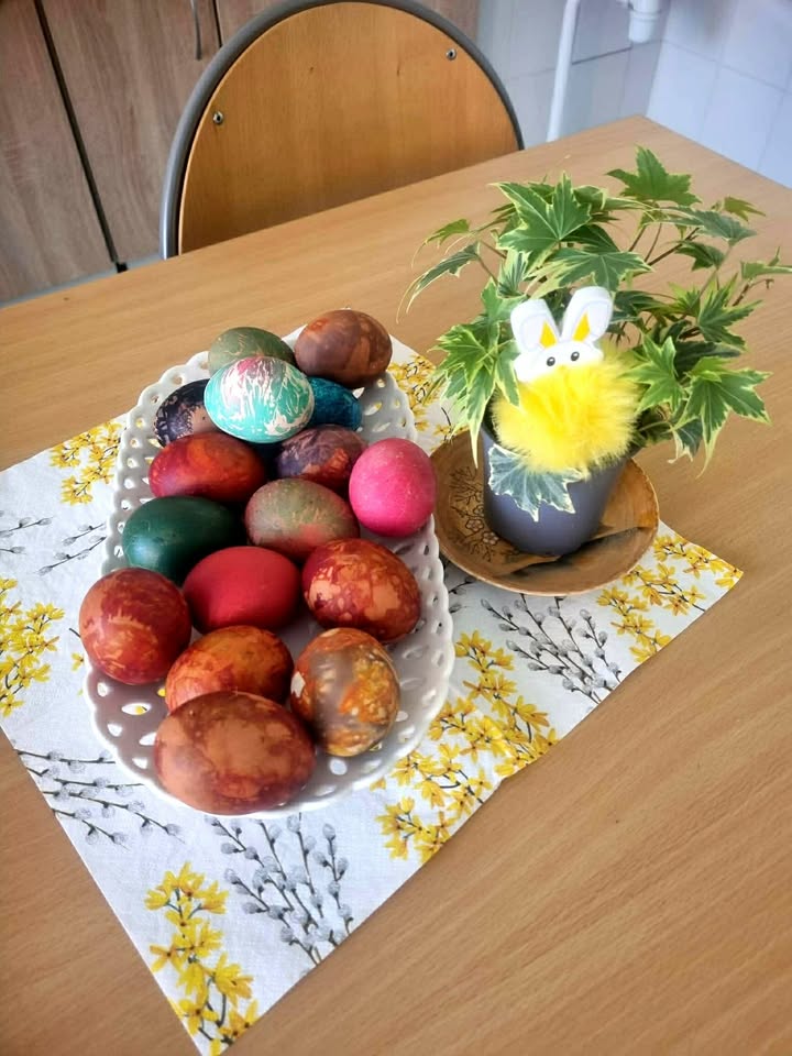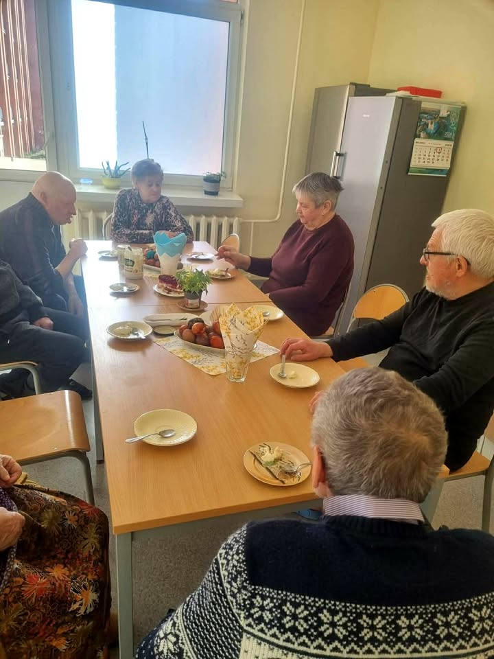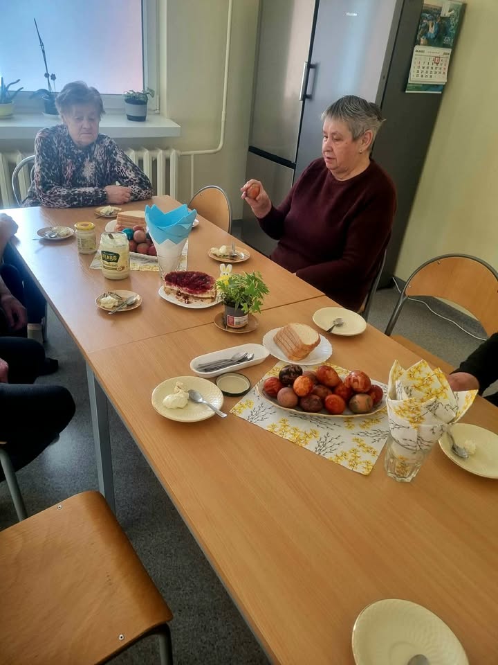 Gyventojai kartu margino kiaušinius, dalinosi prisiminimais ir šypsenomis o stalą papuošė spalvingi margučiai bei pavasariškos dekoracijos.![]()